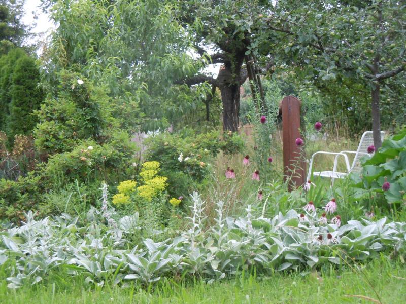 Ein kleiner Lichtblick ist Stachys "Big Ears", die hatte ich gerodet und übrig. Völlig lieblos als Umrandung außerhalb eines kleinen Beetes mitten in der Obstwiese in die Grasnarbe gedrückt und festgetreten. Das war im Mai. 2 mal die wachsenden Grasbüsche dazwischen per Hand weggerupft, und die Wollziestfläche scheint sich gegen die Wiese zu behaupten :D