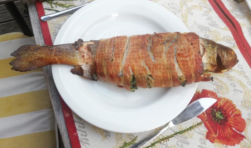 GG ist nicht da. Das ist die Gelegenheit, Süßwasserfisch zu essen. Es gab Forelle vom Grill. Die Füllung bestand aus gedünsteten und gehackten jungen Brennnesselblättern mit Zwiebeln, Pinienkernen, gehackten Rosinen, Semmelbröseln, geriebenem Parmesan. Gewürzt mit Salz und Pfeffer und Weißwein. Umwickelt halbe ich die Fische mit dünnen Baconscheiben.