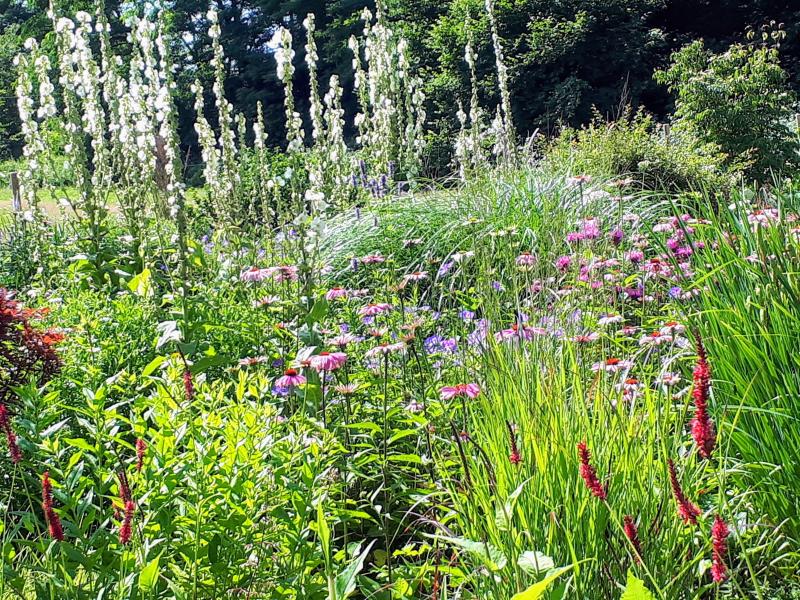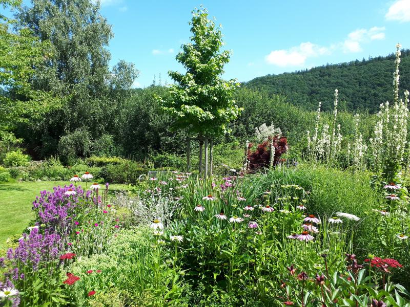 Für mich erstaunlich wie üppig alles wirkt, obwohl ich nach dem Dauerregen schon karrenweise Umfaller geschnitten und abgefahren hatte. Den übrigen Stauden und Gräsern scheint die Feuchtigkeit eher gut zu tun. ;)