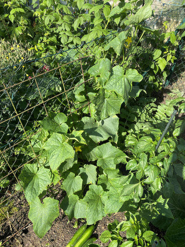 Stimmt, Anspruch ist kein grosser dabei. Hauptsache, es reicht, seit Wochen habe ich mehr Gurken wie wir essen und verschenken können, da ist die Luft auf mehr rausholen doch etwas schaumgebremst, lieber noch den Aufwand minimieren. Diese Zaundinger tragen mit mehreren Früchten alle paar Tage nicht schlecht und vor allem benötigen sie keinen anderweitig nutzbaren Platz. Die ranken von selbst am Geflecht entlang, hier lag noch zufällig eine Baustahlmatte dabei, brauchts aber gar nicht:
