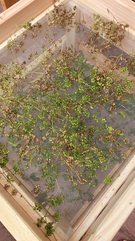 Koriander auf dem frisch gebauten Trickengestell, das mein persönlicher Superheld mir mal eben schnell aus Resten gezimmert hat. Auf der Ebene darunter ist Orangenmelisse. Mal schauen, wie die getrocknet als Tee schmeckt. Als Sirup war schon mal ganz gut.