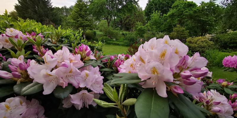 Zurzeit blühen die Rhododendren und die Iris. Der Rhodo ‚Brigitte‘ zeigt eine pastellige Farbe. Bei den Iris fehlen leider die Namenschilder.