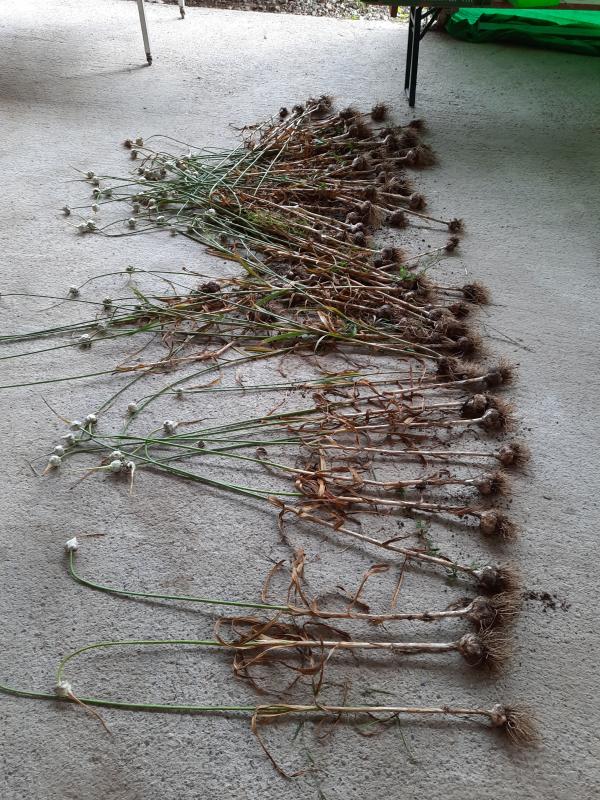 Etagenknoblauch am trocknen, ich hoffe die bubillen trocknen auch an. Diese werden im Herbst mit der Handsämaschine gelegt, und im Frühjahr als Frühknoblauch geerntet.