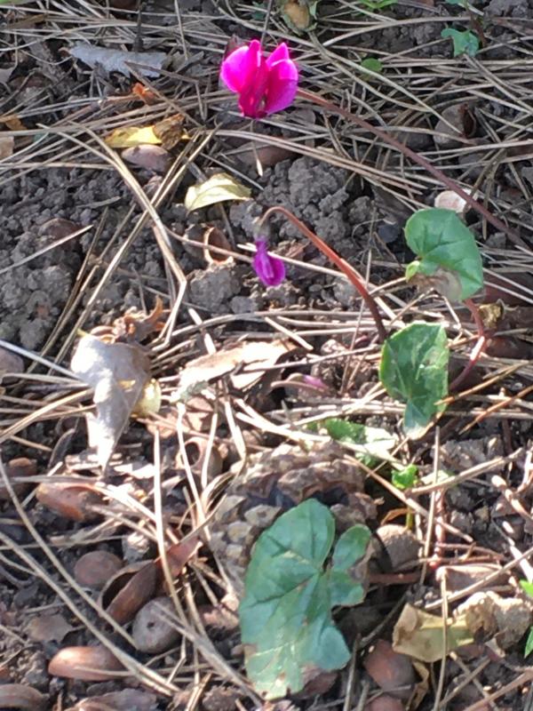 Auch ein Cyclamen hederifolium ´Dark purple´schaut schon ganz neugierig im Garten. Für mich ist die Blütenfärbung etwas anders aber es ist halt eine Erstblüte aus Samen vom Herbst 2019.