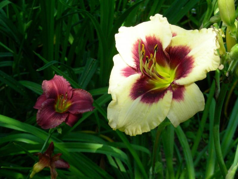 mein Piano Man sah so aus. Links Little Grapette. Bild von 2009. Damals gefiel mir, wenn das Auge/Band mit der daneben blühenden kleinblütigen Taglilie korrespondierte.