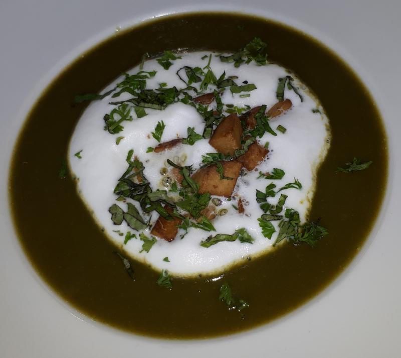 Spinatsuppe mit Milchschaum und gebratenem Räuchertofu