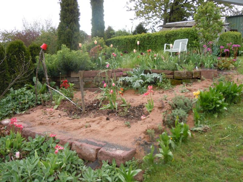 Die Umgrenzung ist aus Artemisia abrotanum (wird geschnitten) und Euporbia seguierana ssp. niciciana. In der Beetmitte zwei historische Rosen "Dülmener Rose" und "Ulster" (man sammelt nämlich auch seltene Rosen, die auch irendwohin müssen ::) ), der Rest ist hauptsächlich Salvia verticilliata "Purple Rain".