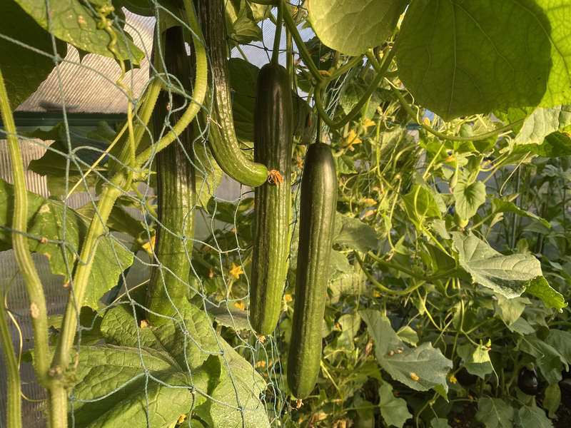 Heute geerntet: Sommerlauch, Broccoli (mehr, als wir essen können) sowie die üblichen Gurkenprügel, mit denen nun sogar alle Nachbarn überversorgt sind. Letztes Jahr wars schwach, dieses Jahr springen einen die Gurken regelrecht an. Meist aus dem Freiland, hier die Extralangen aus dem Gewächshaus: