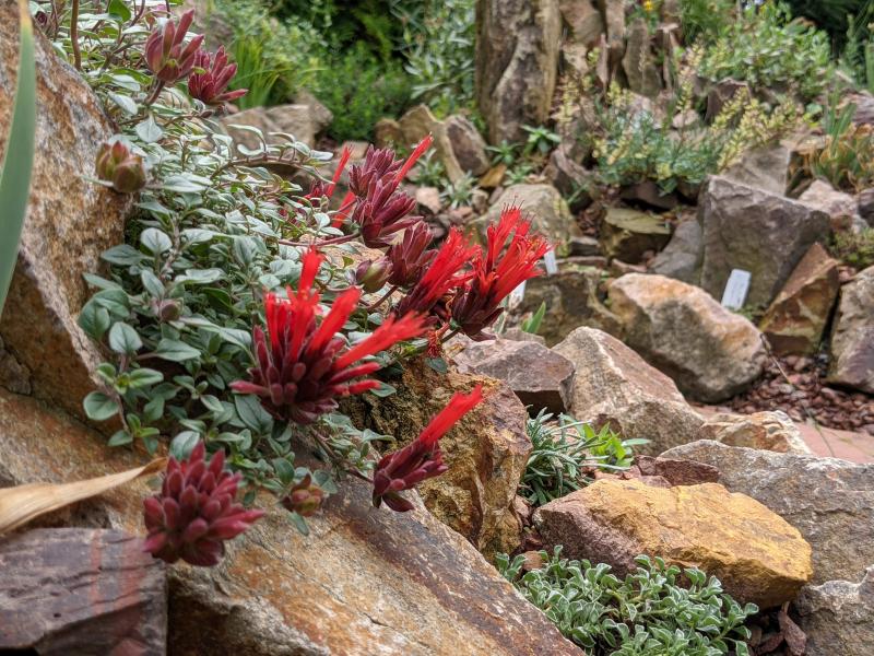 Monardella macrantha 'Marian Sampson' zeigt zum ersten Mal seine charakteristischn leuchtend roten Blüten.