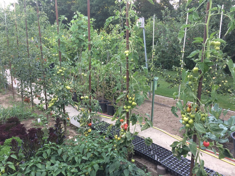 In unserer Gegend gibts keine Freiland-Tomaten mehr. Alle Leute die Tomaten haben, haben sie letzte Wochen rausgerissen einschliessliche die mit knappen, leichten Tomatendächern. Die haben selten geholfen. Wer an den Seiten keinen Schutz hatte, hat Braunfäule-Totalschaden. Einer meiner Nachbarn hatte Seitenschutz, er kämpft noch, aber viele Pflanzen haben nur noch Stengel und ein paar grüne Früchte. Was dann endlich rötlich wird, ist drei Wochen später wie die letzten Jahre.