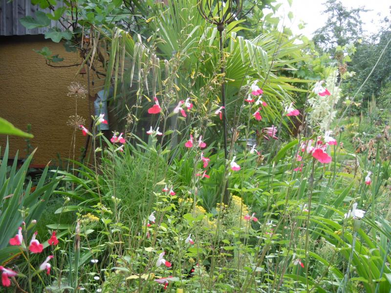 Lavatera olbia, Kniphofia "Alcazar" , Ceanothus "Gloire de Versailles" und Hibiscus "Resi" wuchern dieses Jahr geradezu.