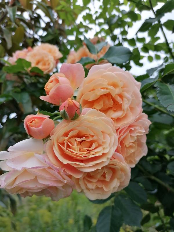 Im Vordergrund "Feurio". Eine Rose für die Vase. Hält dort sehr lange (über eine Woche) und hat einen phantastischen Farbverlauf von Gelb, Orange, warmorange, lederfarben bis hin zu altrosa. Sieht zwischendurch der alten Rose "Alchimist" ähnlich.