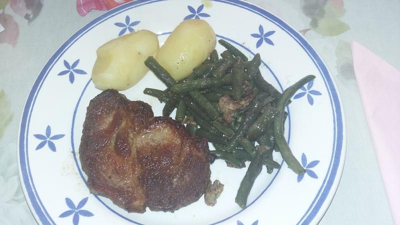 Hier gab es soeben mit Knoblauch und Kräutern mariniertes Schweinesteak mit Pellkartoffeln und geschmorten lila Bohnen aus dem Garten. Lecker. :D