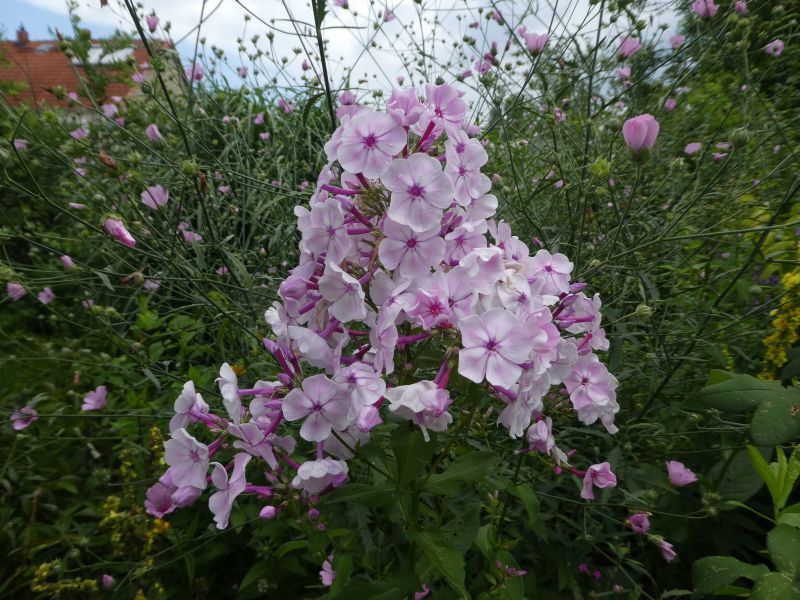 Wie heißt bloß diese filigrane raumgreifende Malve nochmal? Bei ihr steht ein Phlox, von dem ich nicht weiß, woher er kommt oder wie er heißt. Aber das Duo ist grandios.