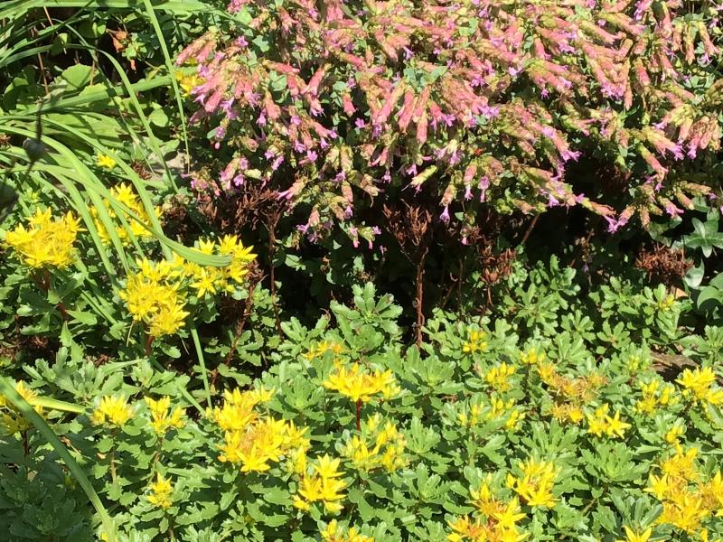Ein paar Blüten finden sich auch jetzt im Steingarten. Auf dem Bild Sedum floriferum die zweite Blüte nach der Hauptblüte im Juni. Zugegeben dies ist keine Pflanze für den Steingartenexperten zu leicht in der Pflege und Vermehrung und zu wüchsig. Dazu hopfenblütiger Oreganum.