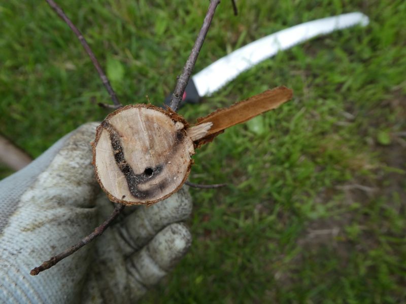 Einer der beiden Triebe ist inzwischen komplett abgestorben. Ich habe ihn abgesägt und das vorgefunden.