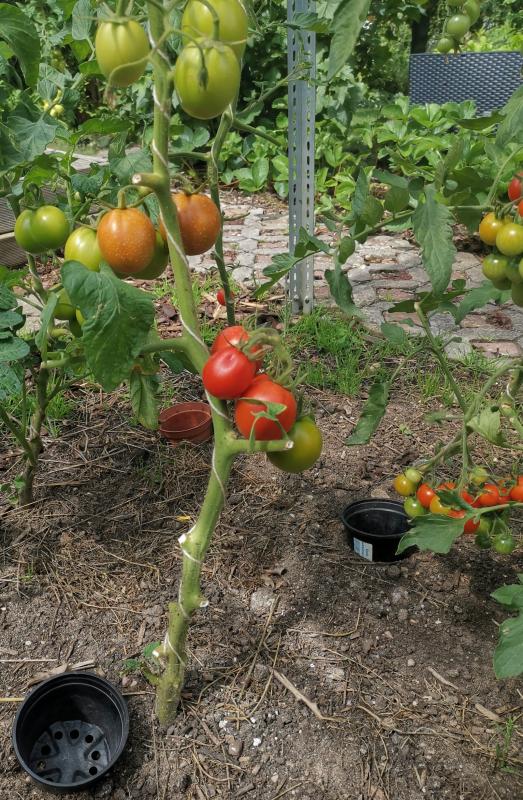 Nochmal zu den Braunfäule-Widerstandsfähigen. Im Anbau habe ich die schon seit ein paar Jahren (geplant ist, damit in einem Aussengarten extensiv ohne viel Pflege Tomaten für die Verarbeitung anzubauen), aber kaum ein Jahr ist besser geeignet, um die zu testen. "Honeymoon" und andere habe ich ja schon genannt, hier Cocktail-Crush, die ersten Roten sind schon abgeerntet: