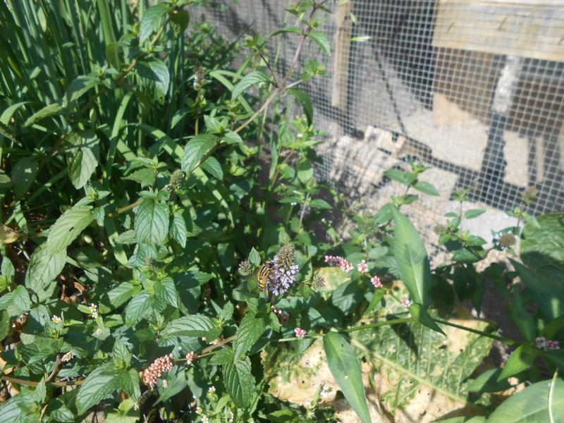 Hier sitzt auch eine an der Minze. Der Kopf sieht schon nach Fliege aus, muss mal schauen ob sie schwebt .Aber ich glaube eher nicht.