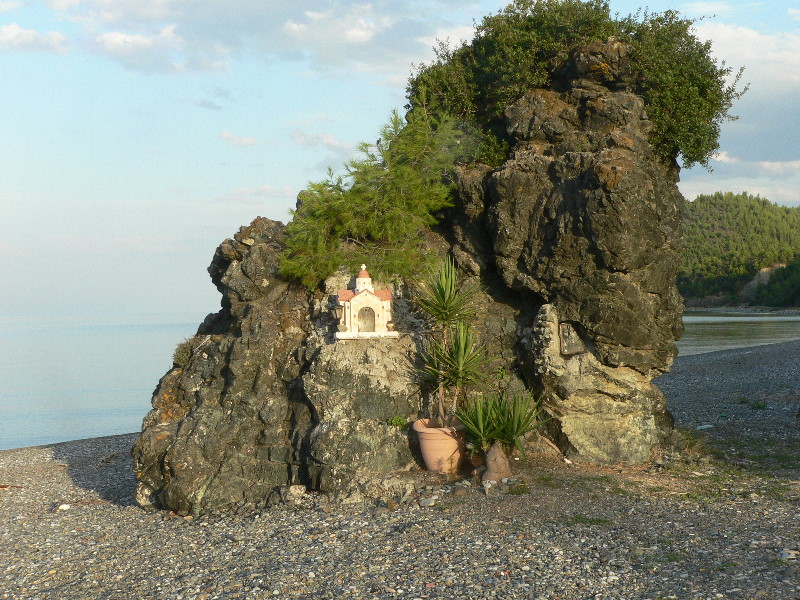 Ellinika ganz im Norden. Das Inselchen mit der Kirche war in bequemer Schwimmentfernung vom Strand.