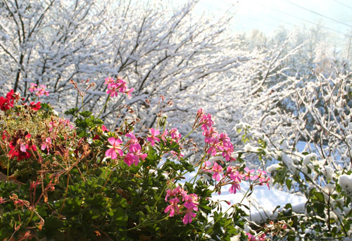 Wir hatten heute morgen eine ähnliche Situation vor Ort.Die Geranien noch auf dem Balkon und der Garten verschneit