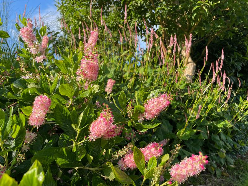 Clethra alnifolia 'Ruby Spice' mit im Hintergrond Persicaria amplexicaulis 'Rosea'. Ton-sur-ton!
