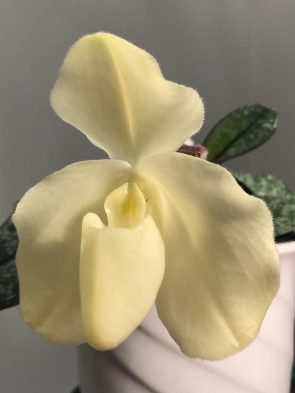 Neu in meiner kleinen Sammlung ist Paphiopedilum wenshanense f. album in einem schönen Zitronengelb, die Blüte öffnet sich aber gerade, daher kann sich die Form noch etwas ändern.