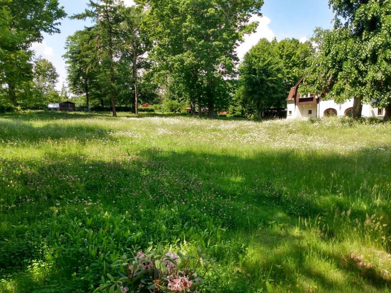 Die Wiese wird zweimal im Jahr gemäht. Das erste Mal Ende Juli, das zweite Mal nach dem vollständigen Laubfall. Es wird immer erst gemulcht. Im Juli lass ich das alles ca. 1 Woche liegen und sammle dann. Im Herbst wird das gemulchte Laub sofort gesammelt und entfernt. Ein Teil davon (ca. 5 m³) wird kompostiert, ein weiterer Teil wird als Mulch unter die Wildhecken geschafft und der Rest wird abgefahren. Alles in allem sind das durch die vielen Bäume ca. 20 - 25 m³ Laubhäcksel. Im zeitigen Frühjahr geh ich mit dem Sammler nochmal drüber um das auf die Wiese gewehte Laub zu entfernen.