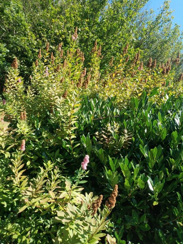 Man kann sie ja ein bisschen in Form bringen, aber immerhin, sie bringen schon etwas Struktur in den Garten, ebenso wie der Apfelbaum und der Kriechwacholder am Hang, das kann man fürs Erste nutzen, um ein paar "Ankerpunkte" fürs Auge zu schaffen. Und vielleicht findest Du die Pflanzen nach einer Weile gar nicht mehr so doof. ;) Der schmetterlingsanziehende Strauch im Kirschlorbeer ist übrigens eine Kolbenspiere, die ist durchaus erhaltungswürdig.