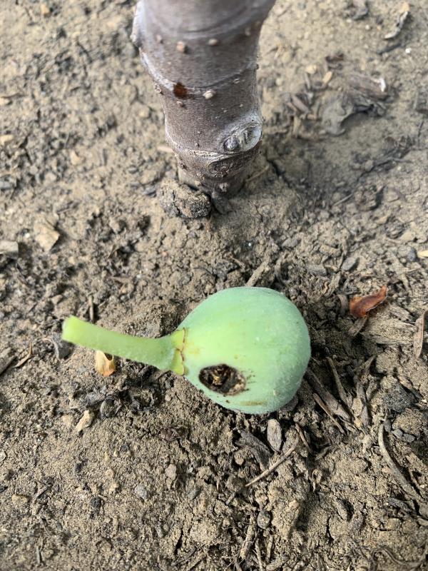 Dabei ist mir aufgefallen, dass der Spreizflügelfalter der wieder voll da ist, einige Früchte direkt befallen hat. Diese gerade heruntergefallene Feige der nordspanischen Latza war schon stark geschädigt.
