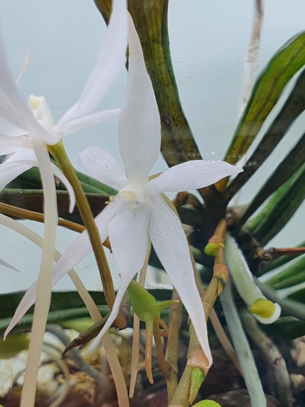 Meine Aerangis kirkii im Flaschengarten blüht jetzt auch. Zum Glück ist das Glas recht groß, trotzdem passen die langen Blüten nicht ganz hinein.