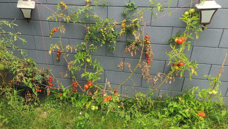 Hier ist das schlechteste Tomatenjahr aller Zeiten. Ich habe letzte Woche die letzten Pflanzen entfernt. Seit Anfang Juli zupfe ich schon ständig Braunfäulebefall ab, jeden Tag gegen Abend gabs ein paar Spritzer Regen. Nach und nach habe ich alle Pflanzen entfernt, die Tomatenrispen zum Nachreifen wurden alle von der Fäule erwischt. Insgesamt gab es vielleicht 30 Tomatenfrüchte von 30 Pflanzen diverser Sorten :P