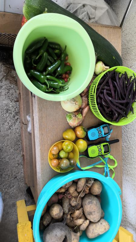 Heute waren es eine Schale Stangenbohnen, Tomaten, Jalapeños (zum Einlegen), eine zu groß gewordene Zucchini und Kartoffeln. Dazu eine rote Bete, in der eine Spanische Wegschnecke im eigenen Loch steckte und fröhlich knusperte.