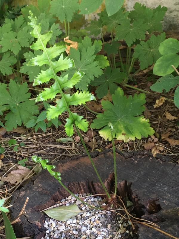 Das Teilstück von Polypodium cambricum ‚ Oakley‘ hat‘s an sehr trockener Stelle im Baumstrunk ( wenn auch dieses Jahr etwas feuchter) geschafft. Hatte ich letztes Jahr dort reingesteckt.