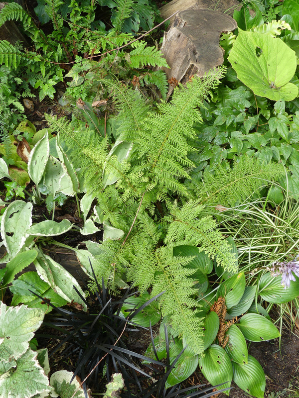 Polystichum setiferum 'Plumosum Selection' hat sich inzwischen voll entfaltet.