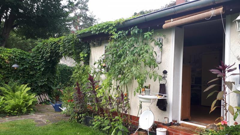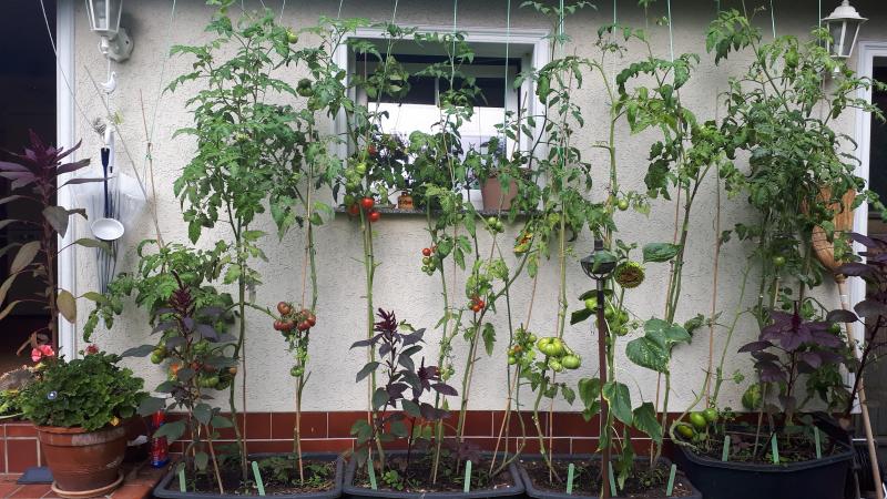 UNd noch links neben der Tür. Es sind jetzt 8 Kübel a 3 Pflanzen. Ach ja, im Gegensatz zum vergangenen Jahr sieht die "Handschuhheimer Feldtomate" in diesem Jahr großartig aus, auch noch recht gesund.