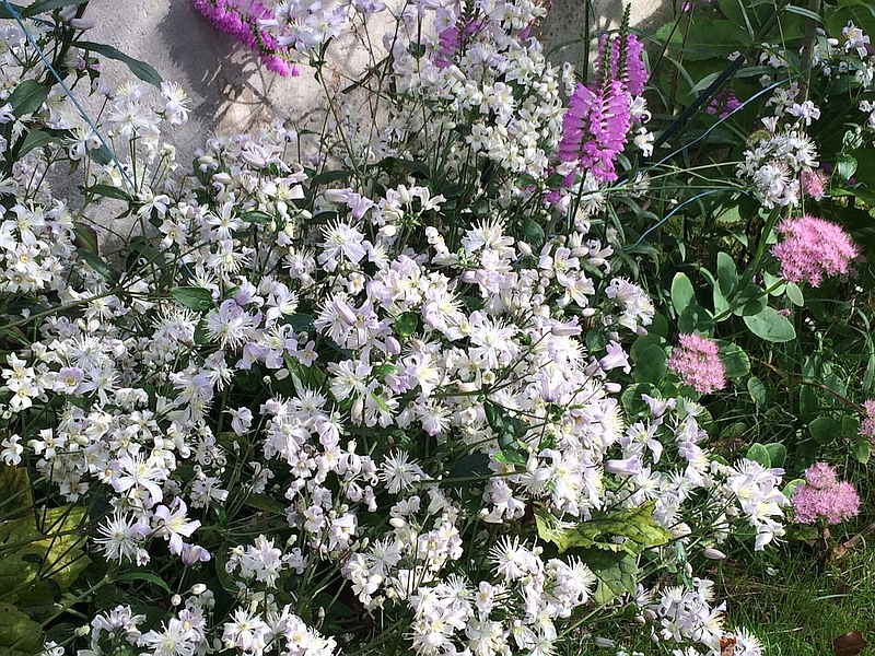 Eine Staudenclematis, die ich durch andere Stauden erst jetzt wieder gesehen habe, strengt sich an:
