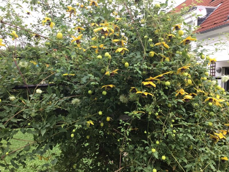 Clematis serratifolia „Golden Tiara“ legt jetzt richtig los. Den ganzen Sommer immer einzelne Blüten jetzt werden es richtig viele