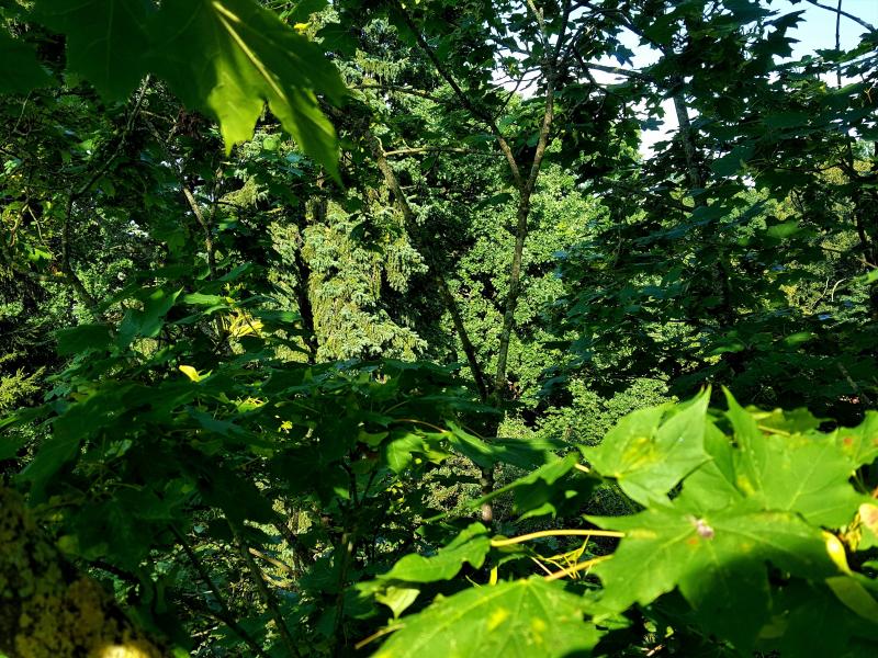 Wir haben 3 zum Klettern geeignete Bäume im Garten, dies ist der Blick vom Ahorn nach Nordost.