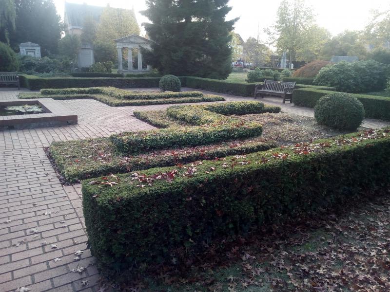 Die Kugeln sind natürlich Buchs. Die strenge Einfassung vorn und um die Bänke herum ist Eibe. Das Zickzack mit Erhöhung ist Spindelstrauch.