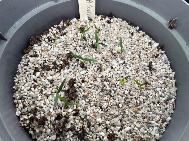 Keimung: Mitte Juli 2021 zeigten einige Samen ein Wurzel. Samen werden aus der Kühlschrank geholt und im Topf draußen gesät (13 Juli 2021). Nach eine Woche oberirdische Keimung von einige Samen.