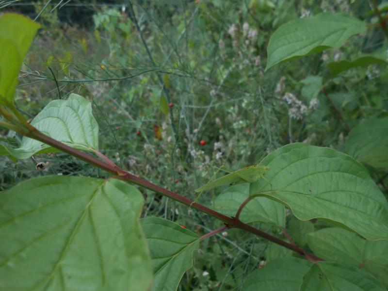 Auf unserem Acker sitzt dieses Heupferd gut getarnt, ich sah es nur, weil es gehüpft ist. Es hat gelbe Beine :o.