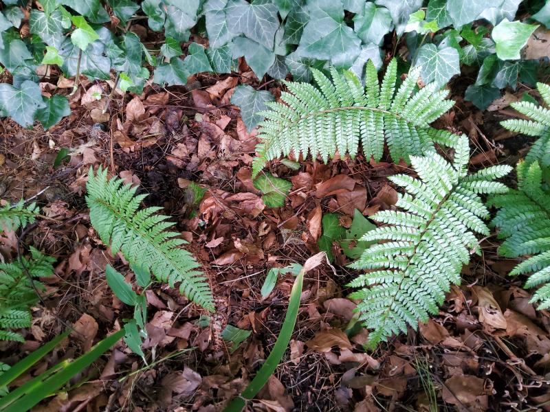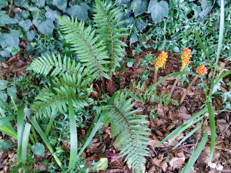 und hier ist es sonderbar, lt. Schild und Aufzeichnung Dryopteris affinis, der sieht aber so völlig anders aus. Zunächst einmal ist er so dunkel (Standort? er steht richtig dunkel, die unter der Magnolie deutlich heller). Und dann sehen die braunen und dicht behaarten Mittelrippen doch eher nach Polystichum aus. Er glänzt außerdem ???.