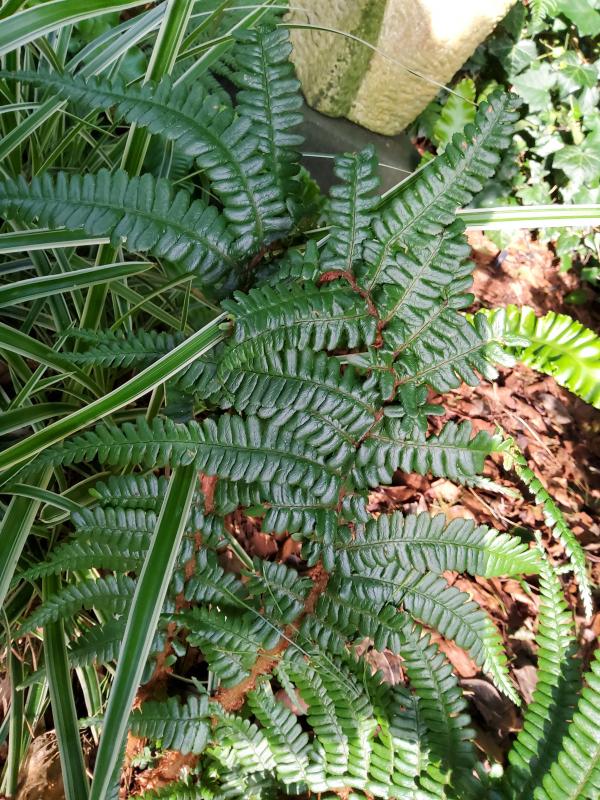 Polystichum polyblepharum Nr. 2, glänzt nicht, sieht etwas anders aus, aber die Art wird sicher auch durch Sporen vermehrt, so dass es abweichende Typen geben kann - ist er's oder nicht?