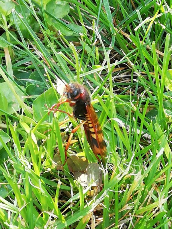 Fotos zu machen war gar nicht so einfach. Ich habs versucht und bin über die Bildersuche im Netz auf den Bienenwolf gestoßen. Aufgrund der Größe tippe ich auf ein Männchen.