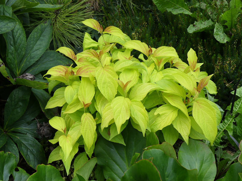 Mir fiel heute wieder Cornus sericea 'Kelsey's Gold' ins Auge. Die gekauften Exemplare sind veredelt. Vom Bruch, der beim Transport entstand, hatte ich seinerzeit zahlreiche Stecklinge gemacht, von denen sage und schreibe einer bewurzelte. Der macht sich aber nun ganz gut. Vielleicht versuche ich es mal mit Anhäufelung, ihn zu vermehren.