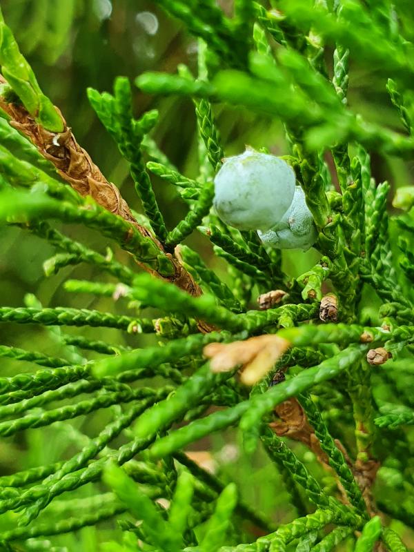 Vielleicht verringert es etwas die Sporendichte, wenn ich die ganz nahen Zierwacholder entferne. Möglicherweise haben wir doch auch selbst welchen. Beim Kompost steht ein Wacholder, den bestimme ich erstmal nächstes Wochenende.