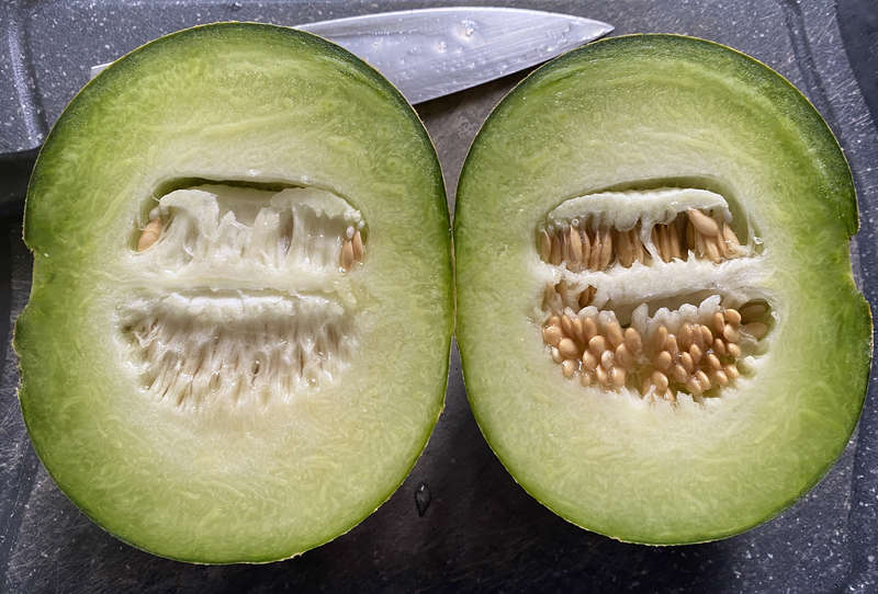 Aroma aber gut. Samtig, saftiges Fruchtfleisch. Im vollreifen Zustand sollte man sie nur kühl lagern, maximal 24h. Sonst kann es sein, dass schon etwas Gärgeschmack dazukommt. Kommerziell werden alle Cantaloupes mit Stiel geerntet, bevor er sich löst, dann lassen sie sich gekühlt noch eine Woche herumkarren, verlieren aber dabei stetig an Aroma.