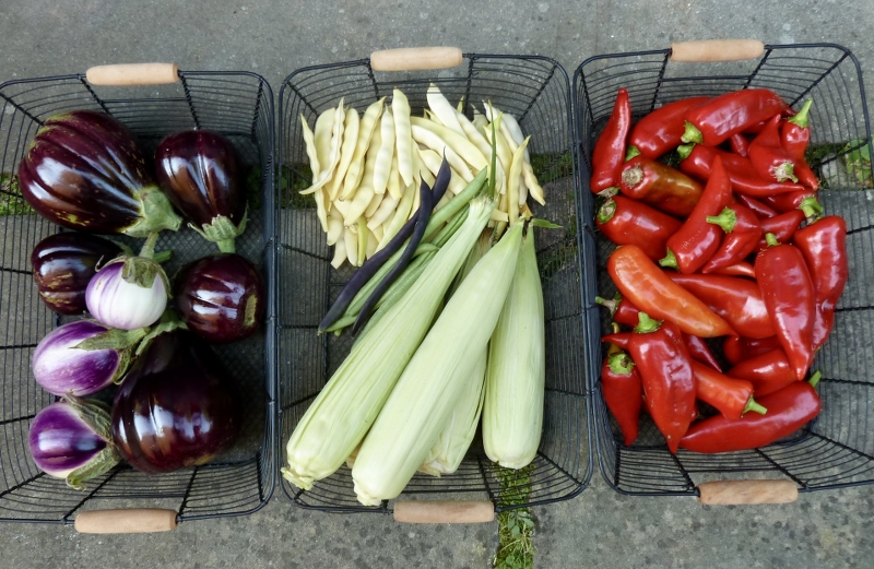 Zuckermais, Paprika, ein paar Stangenbohnen und Auberginen.