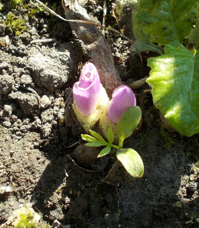 Das, was aus dem Feistritztal als C. pannonicum hierher gelangt ist, spitzt auch gerade aus der Erde – und schon ist ein Teil der linken Knospe weggeraspelt >:(