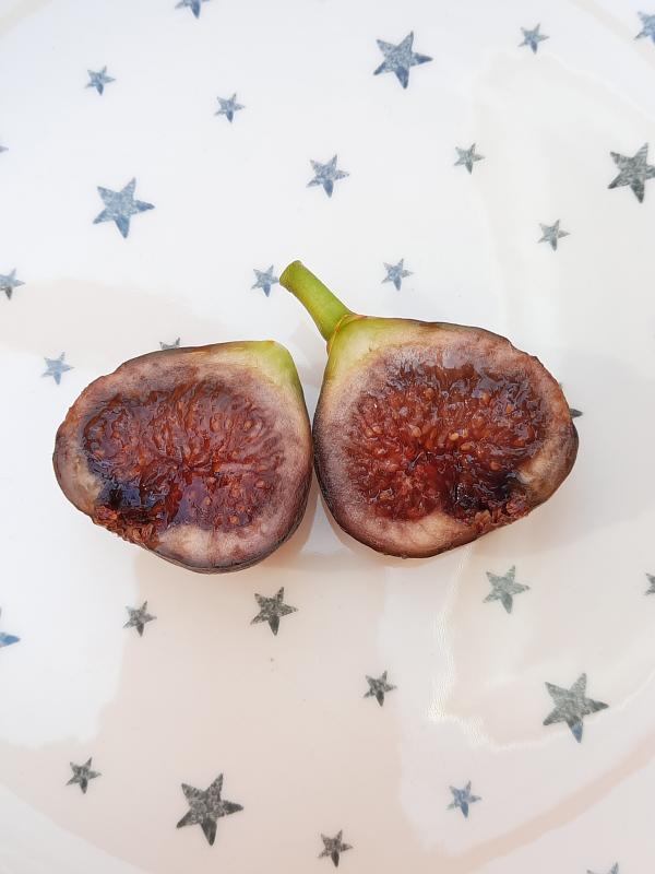 Auf dem Foto eine heute morgen geerntete Feige. Sieht aus wie eine Brown Turkey, ist aber wahrscheinlich keine. Die Sorte ist mir leider nicht bekannt. Als ich sie vor zwei Jahren gekauft hatte, war ich noch Feigenneuling und hatte nicht auf das Sortenschild geachtet. Sie ist bislang sehr schwachwüchsig. Zuwachs in diesem Jahr lediglich ca 5 bis 7 cm. Bisher habe ich an der Pflanze nur Herbstfeigen gesehen. Die Früchte werden ziemlich groß (um die 90 bis 100 Gramm). Wenn die Früchte direkt von der Sonne beschienen werden, färben sie sich meist tief lila, nur der obere Teil am Hals bleibt dann grün. Die hier gezeigte Frucht war vom Blattwerk ziemlich beschattet und hat deshalb keine so ausgeprägte lila Färbung. Die Textur der reifen Frucht ist zart, saftig, der Geschmack ist süß, melonig, erinnert sehr an Honig, die Kerne sind kaum zu spüren. Mir hat sie super geschmeckt. Neben Negronne ist das bislang meine bevorzugteste Sorte. Das Geschmacksprofil erinnert mich an Dottato (ebenfalls Typ Honigfeige), aber diese Feige hier wird größer und schmeckt mir auch besser als Dottato. Die Dottato ist deshalb bei mir wieder rausgeflogen.